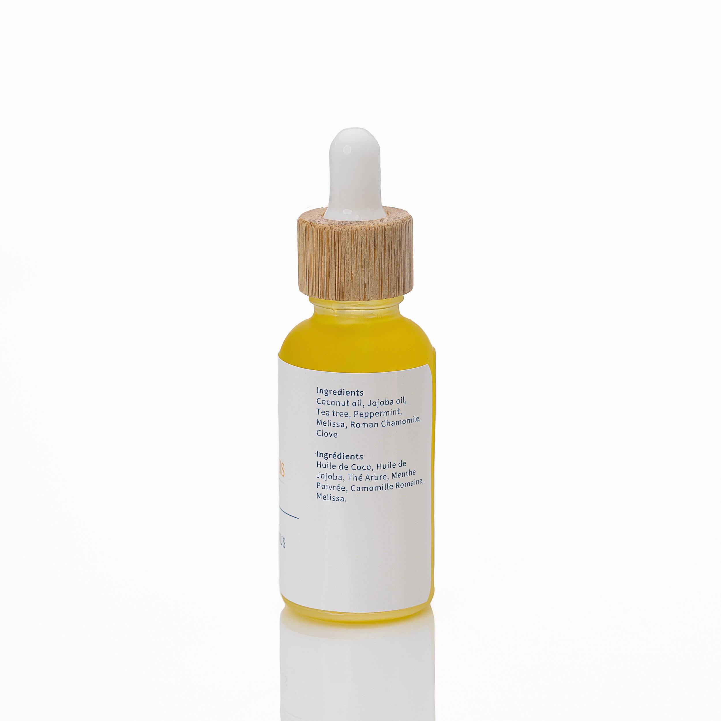 Ingredients: Coconut oil, Jojoba oil, Tea Tree, Peppermint, Melissa, Roman Chamomile, Clove